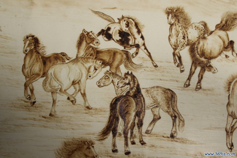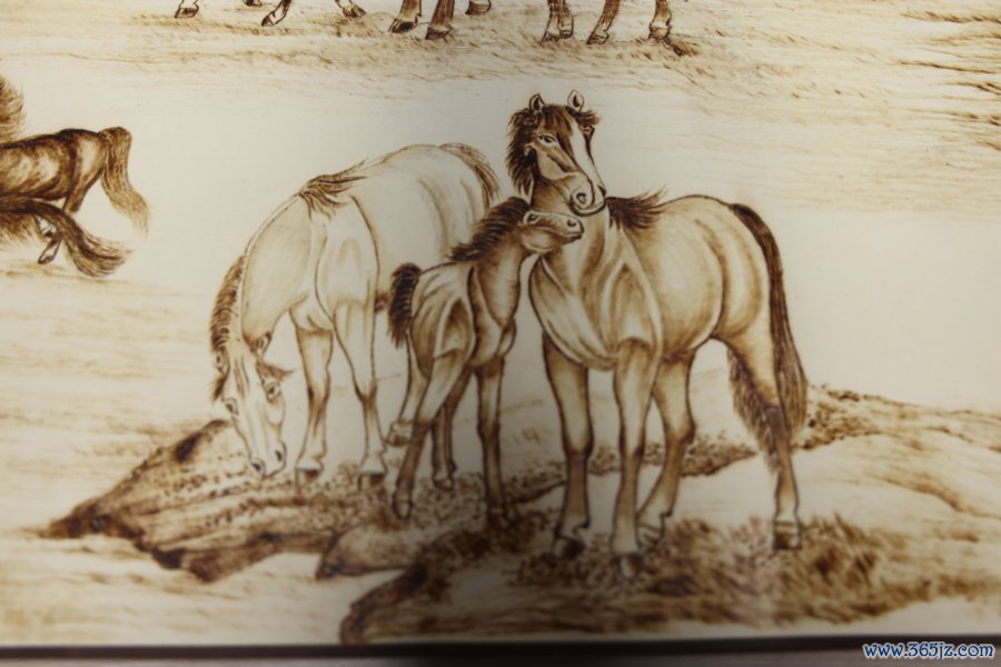 马鬃的鲜艳需要用尖头烙铁快速划过,变成由深至浅的渐变;马身的肌肉线条需要平头烙铁截至停留,营造出立体感。一匹中等复杂度的骏马,从草图到完成至少需要5个小时。