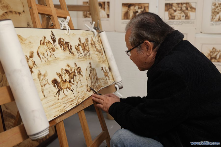 朱泾镇烙铁画达东说念主焦永兴在责任室创作骏马图
